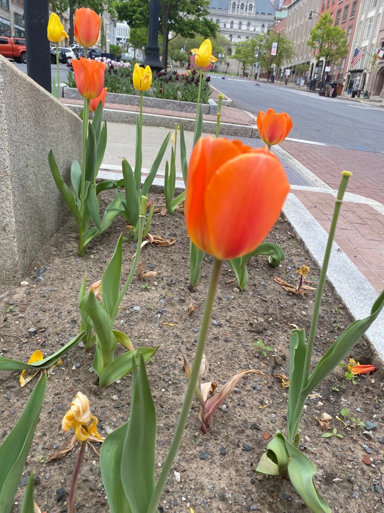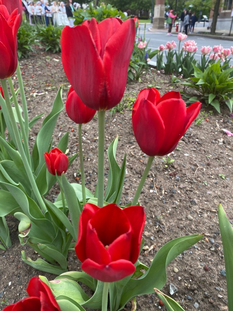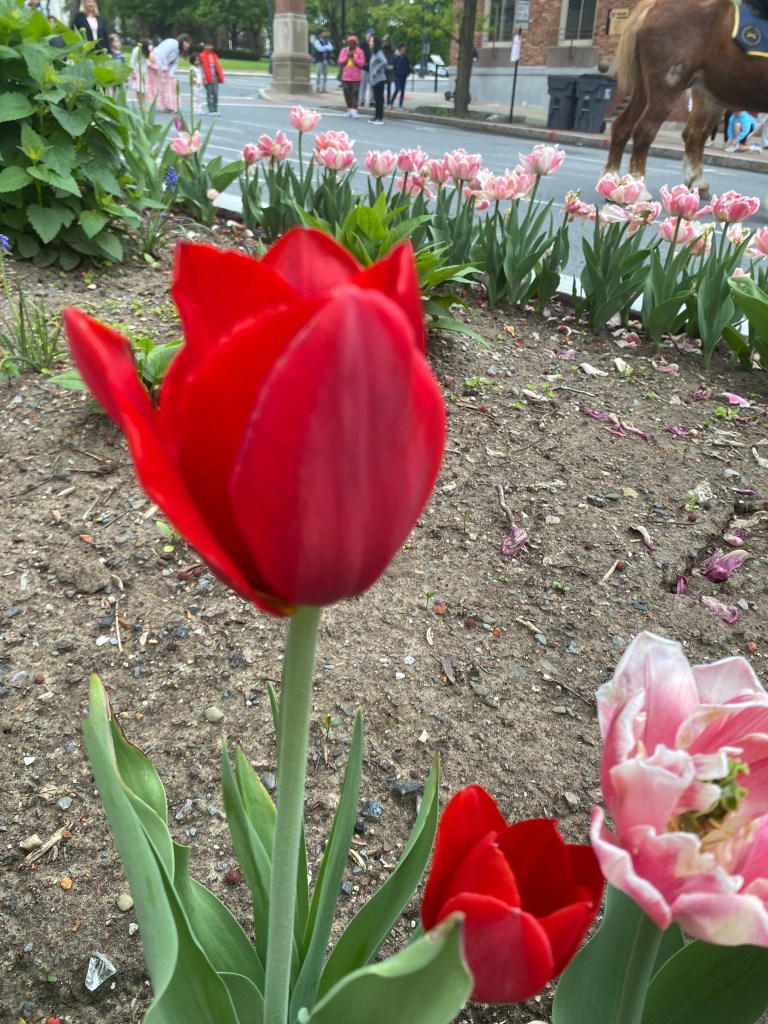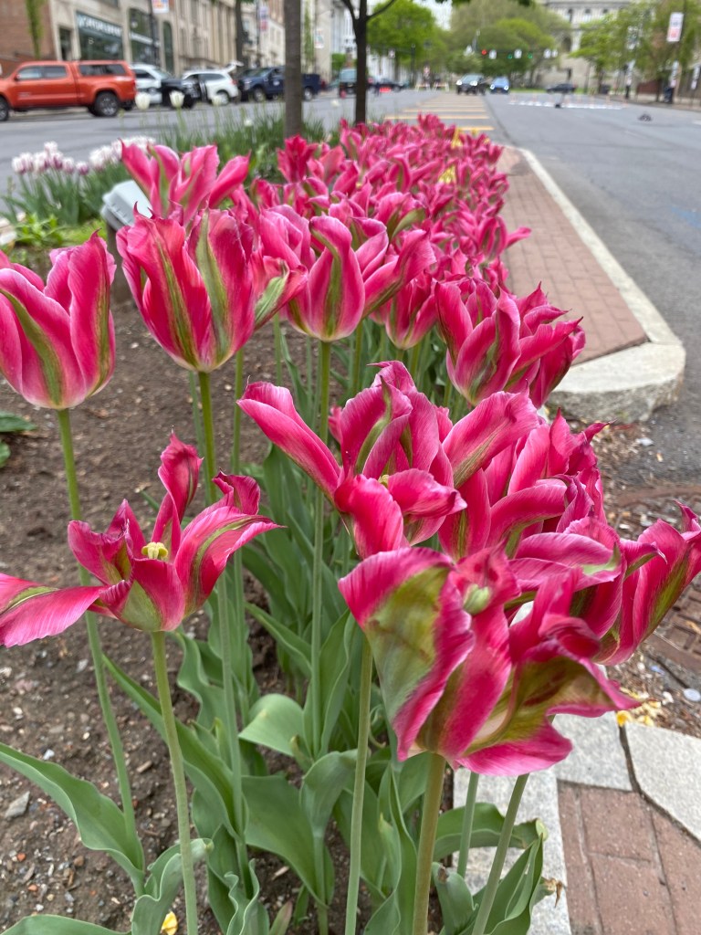 2 whole blocks of tulip beds fill both sides of the median on Upper State Street Hill between Pearl & Eagle Streets, centered around Lodge Street in front of the French-gothic St. Peter’s Episcopal Church, circa 1859.