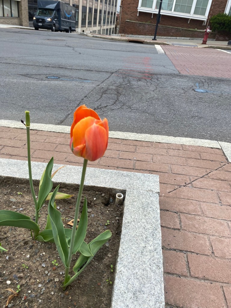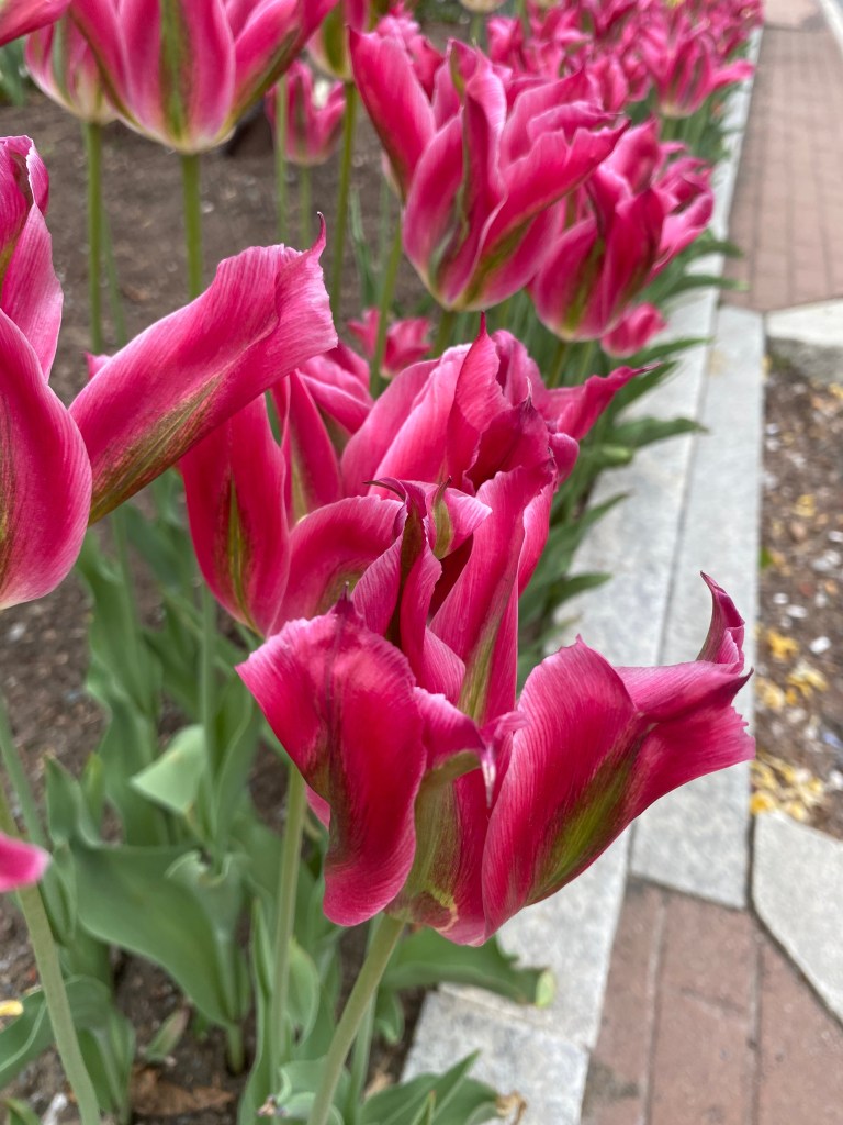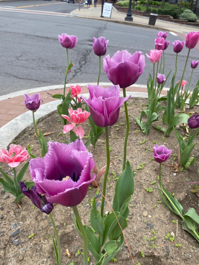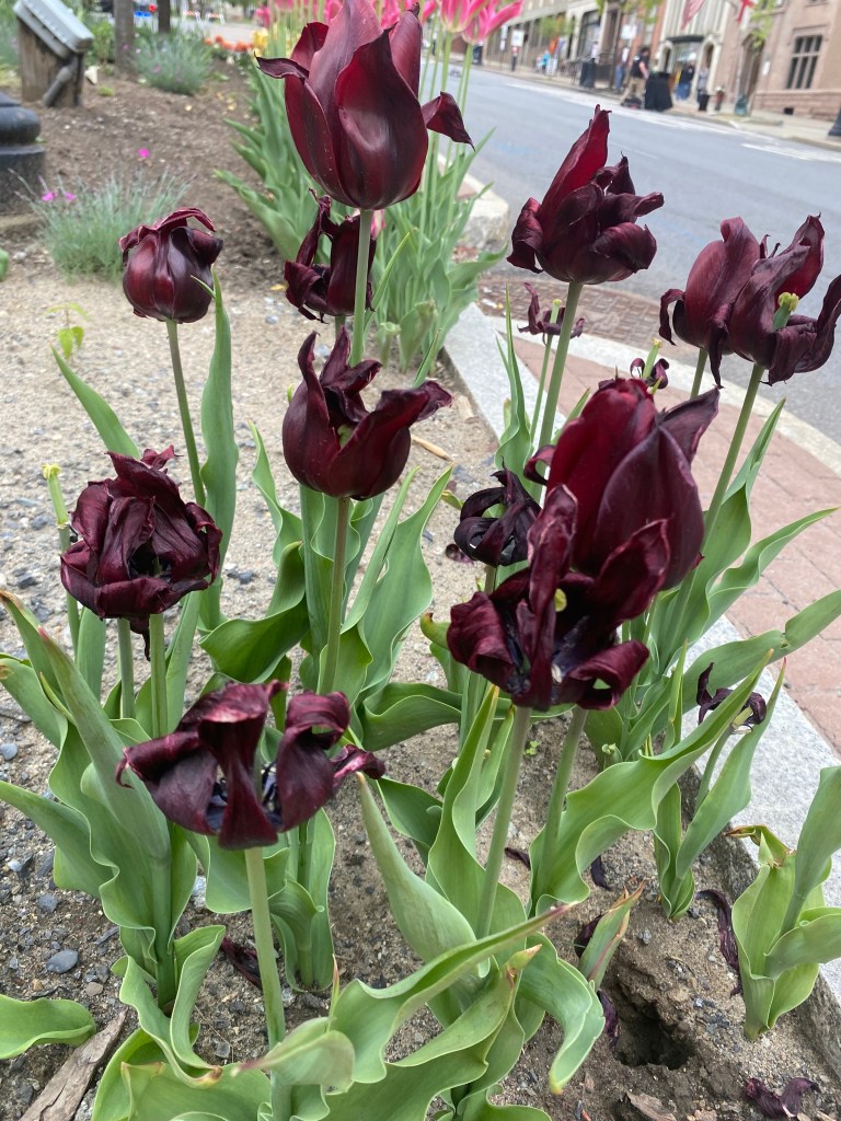 2 whole blocks of tulip beds fill both sides of the median on Upper State Street Hill between Pearl & Eagle Streets, centered around Lodge Street in front of the French-gothic St. Peter’s Episcopal Church, circa 1859.
